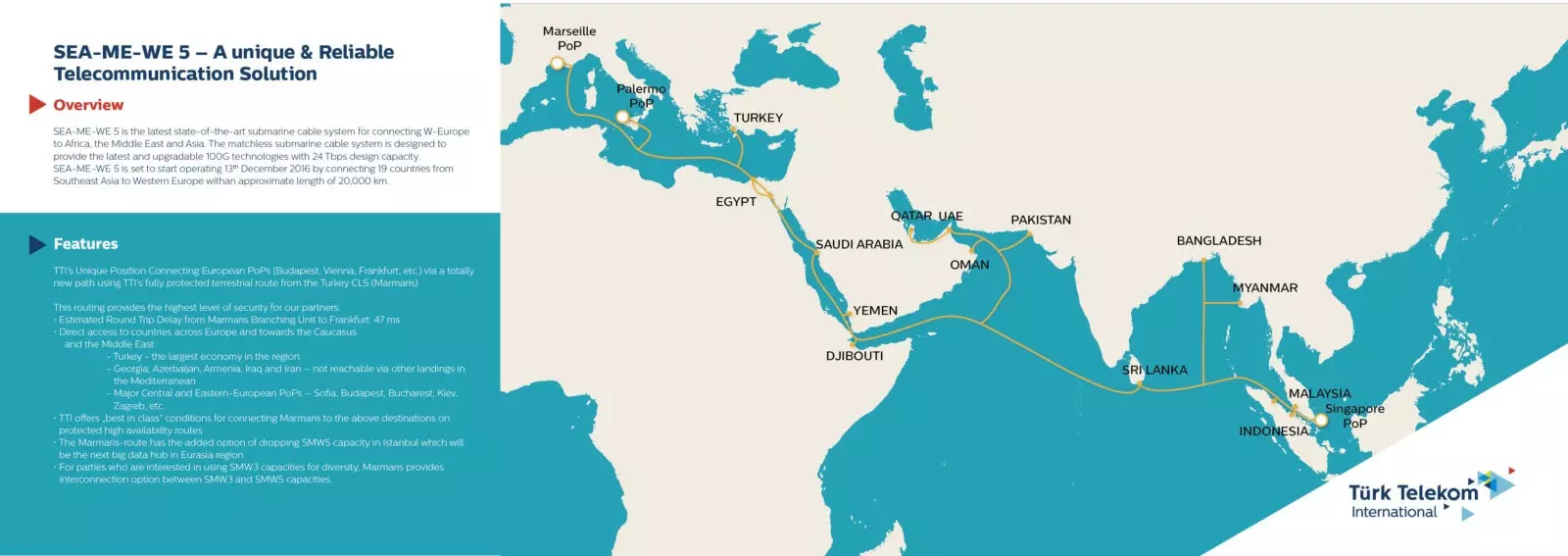 Working with Türk Telekom International, you have the opportunity to utilize this amazing new route and be part of the future of Asia-Europe communications. SEA-ME-WE-5 is designed to be the premier route connecting Asia and Europe.